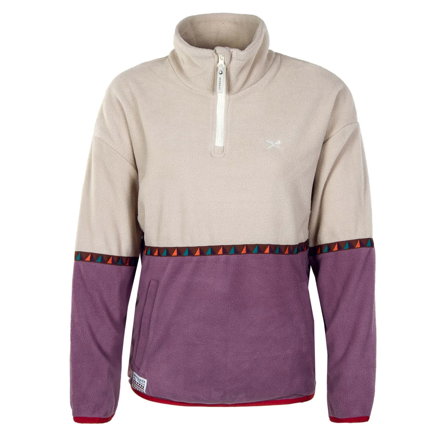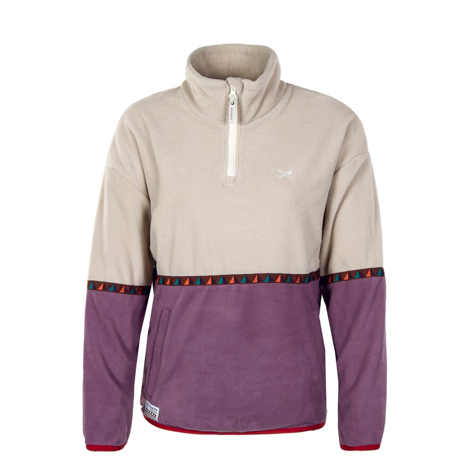 Der IRIEDAILY Holina Fleece Troyer ist ein konstrastfarbiger Pullover aus weichem Polar Fleece, welches aus recyceltem Polyester hergestellt wurde. Das Band mit geometrischem Muster gibt dem Troyer mit dem typischen halblangen Reißverschluss den letzten Schliff.
