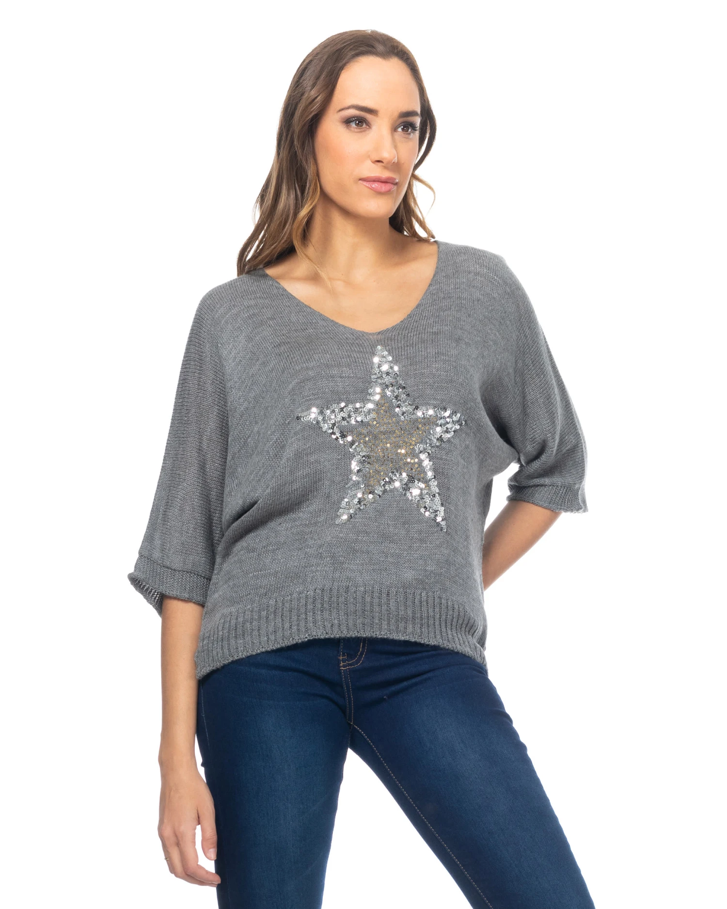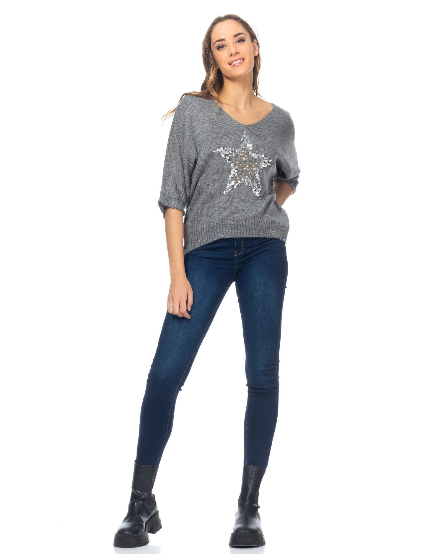 Strickpullover mit Strassstern und Dreiviertel-Ärmel
